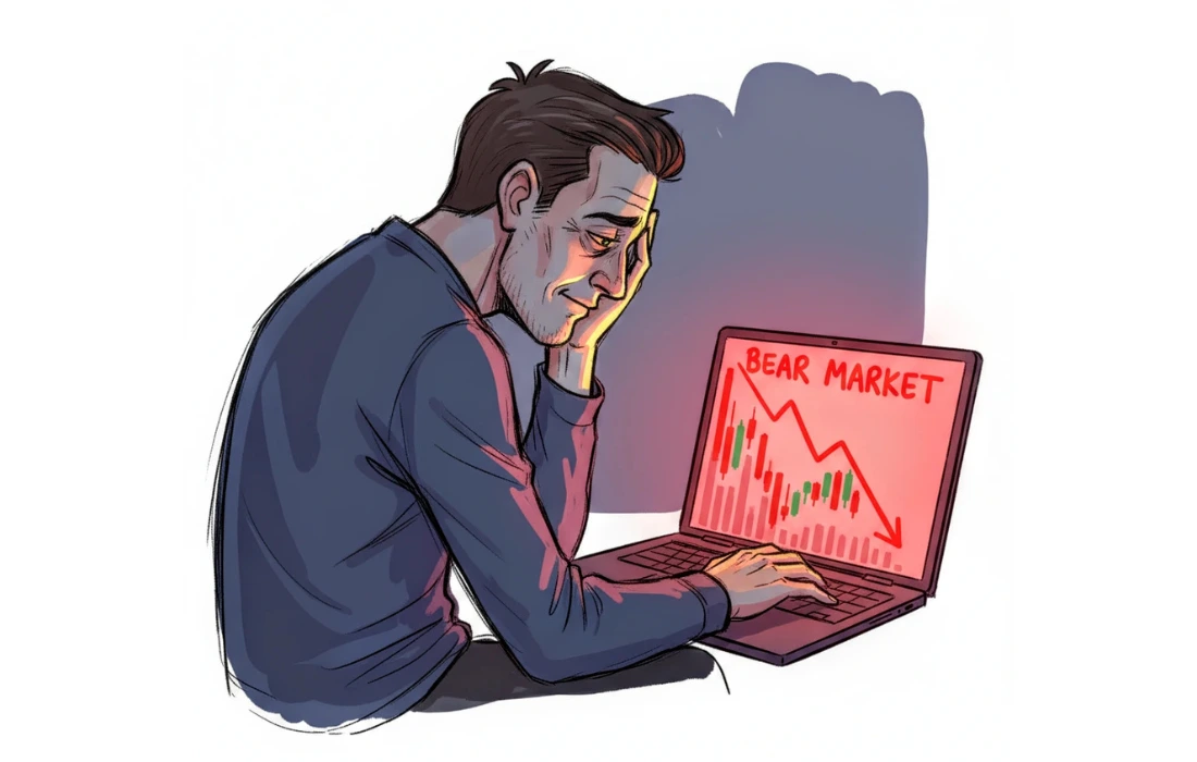 Alt text: A tired man sits in a dimly lit room during a bear market, staring at a falling chart on his laptop. His face shows exhaustion mixed with faint hope.